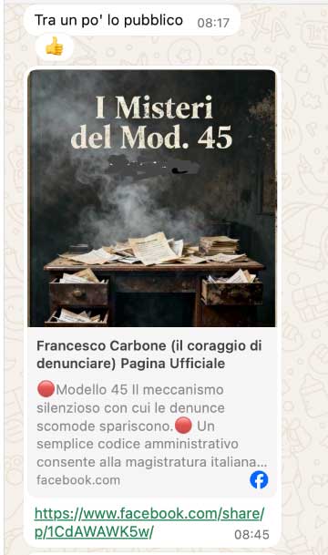 Non avevo chiesto aiuto. A nessuno. È stato Francesco Carbone a contattare me – non il contrario. Mi ha inviato, senza che glielo chiedessi, sentenze, consigli, commenti. Sono arrivati al momento giusto. Io l’ho ringraziato – in modo sincero e riconoscente.