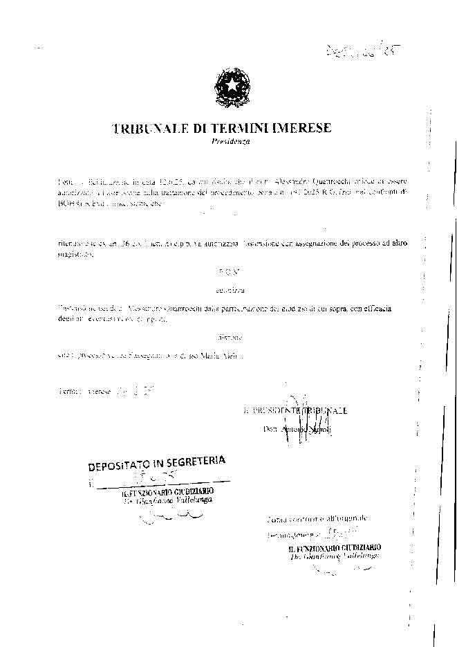 Termini Imerese/Bompietro, 2 settembre 2025 – Nel procedimento penale contro Evarella, giornalista tedesca e difensora dei diritti umani e degli animali, il giudice originariamente incaricato, Dott. Alessandro Quattrocchi, ha chiesto ufficialmente il 12 giugno 2025 di astenersi dal processo. Il presidente del Tribunale di Termini Imerese, Dott. Antonio Napoli, ha accolto la richiesta di astensione e assegnato il processo alla Dott.ssa Maria Aiello.