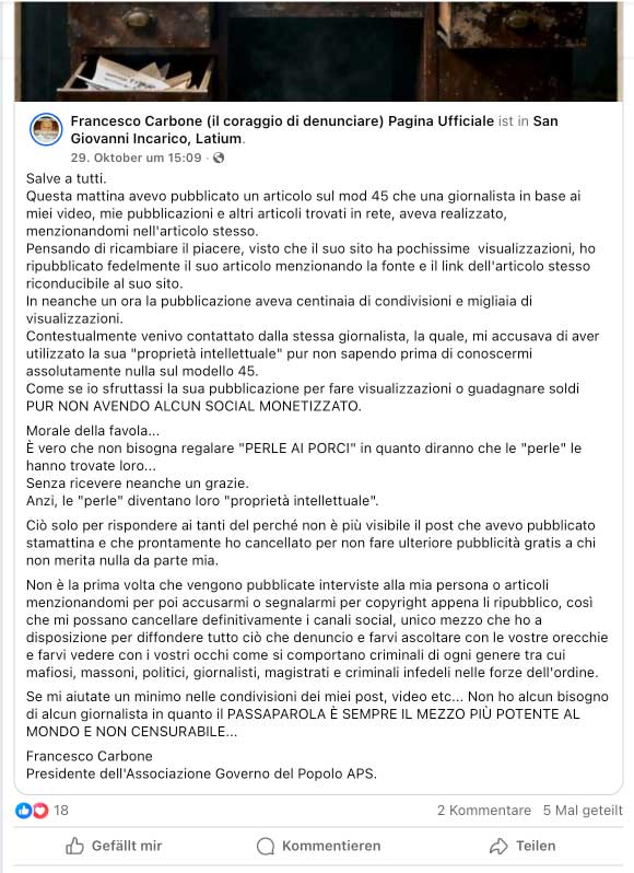 "...Non è la prima volta che vengono pubblicate interviste alla mia persona o articoli menzionandomi per poi accusarmi o segnalarmi per copyright appena li ripubblico, così che mi possano cancellare definitivamente i canali social, unico mezzo che ho..."